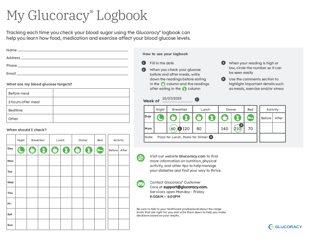 Tracking each time you check your blood sugar using the Glucoracy® logbook can